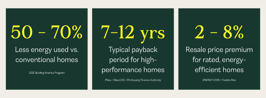 The second layer is maintenance and equipment lifecycle savings. This is the one homeowners most often overlook. Oversized mechanical systems in leaky, poorly insulated homes cycle on and off constantly, wearing out faster and requiring replacement on shortened schedules. In a tight, well-insulated envelope, a smaller, right-sized system runs smoothly and consistently. That kind of sustained energy reduction adds up quickly. Industry research consistently places the payback period for high-performance upgrades in the 7 to 12 year range, a figure supported by data from Phius, MassCEC, and the Pennsylvania Housing Finance Authority, with the timeline shaped by local energy prices and the specifics of each project.