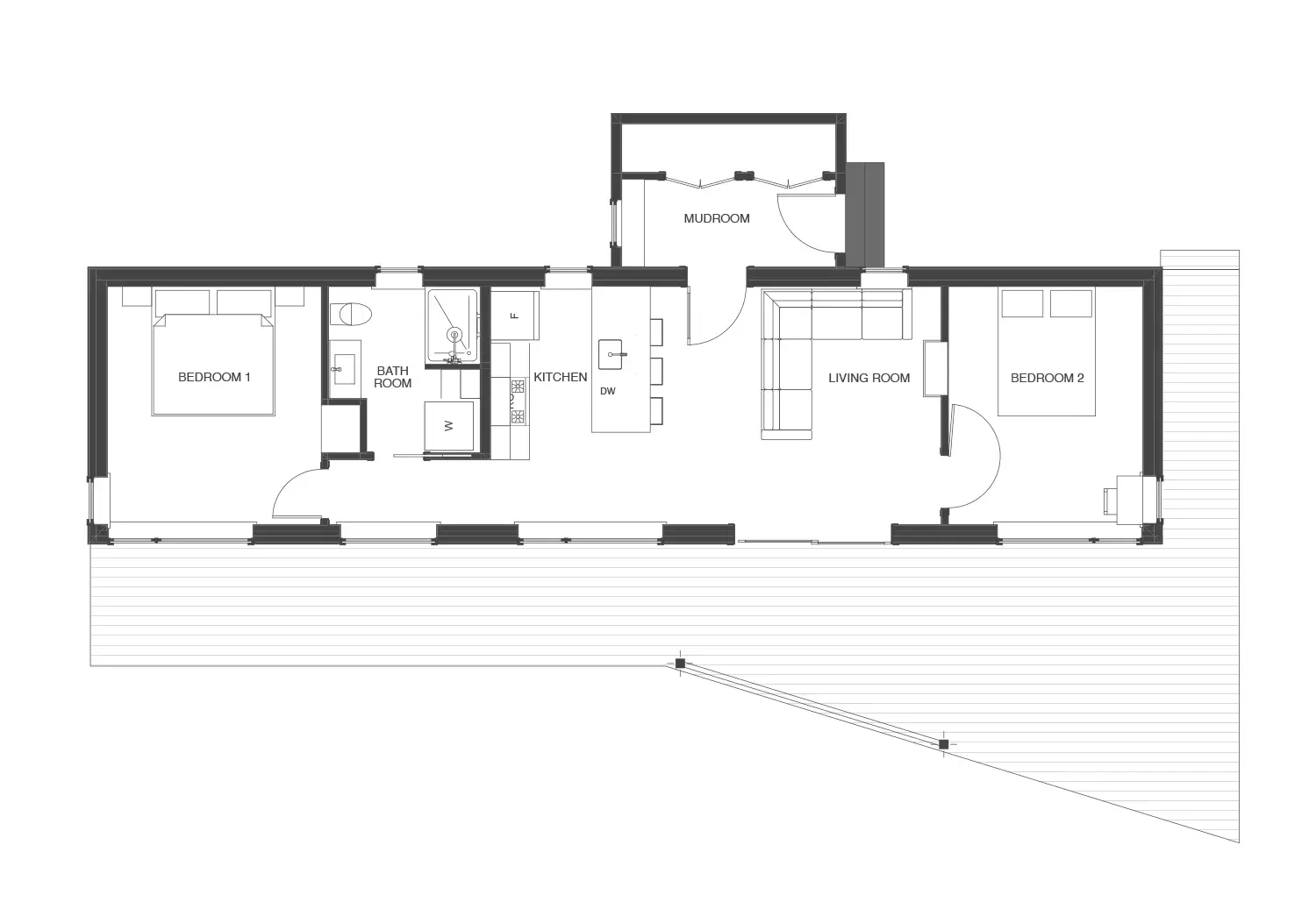 A young couple with a vision to turn their wooded lot into a welcoming destination seeded this first stunning structure for their retreat. With the scale of an ADU, and the light and spaciousness of a full sized home, this shed-roof, vaulted ceiling design knows how to make the most of light and site. Additions such as a matching sauna and a sprawling deck complete with hot tub and light-strung trellis further expand on this 2-bedroom retreat that anchors the bigger vision.